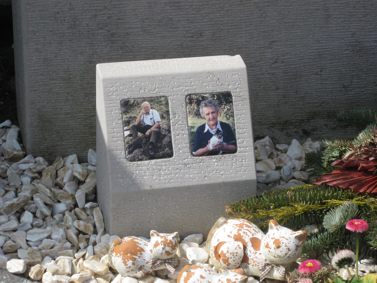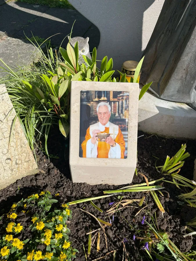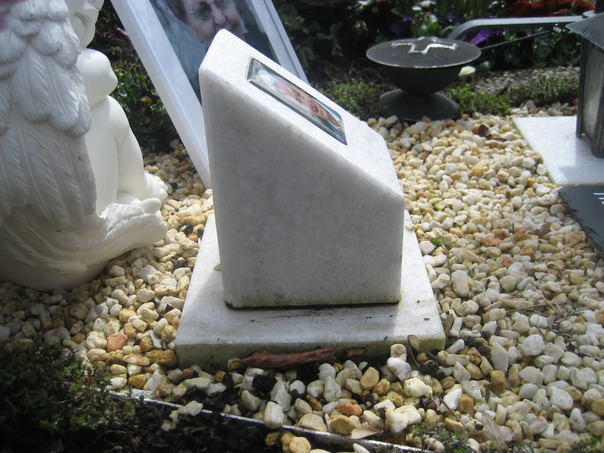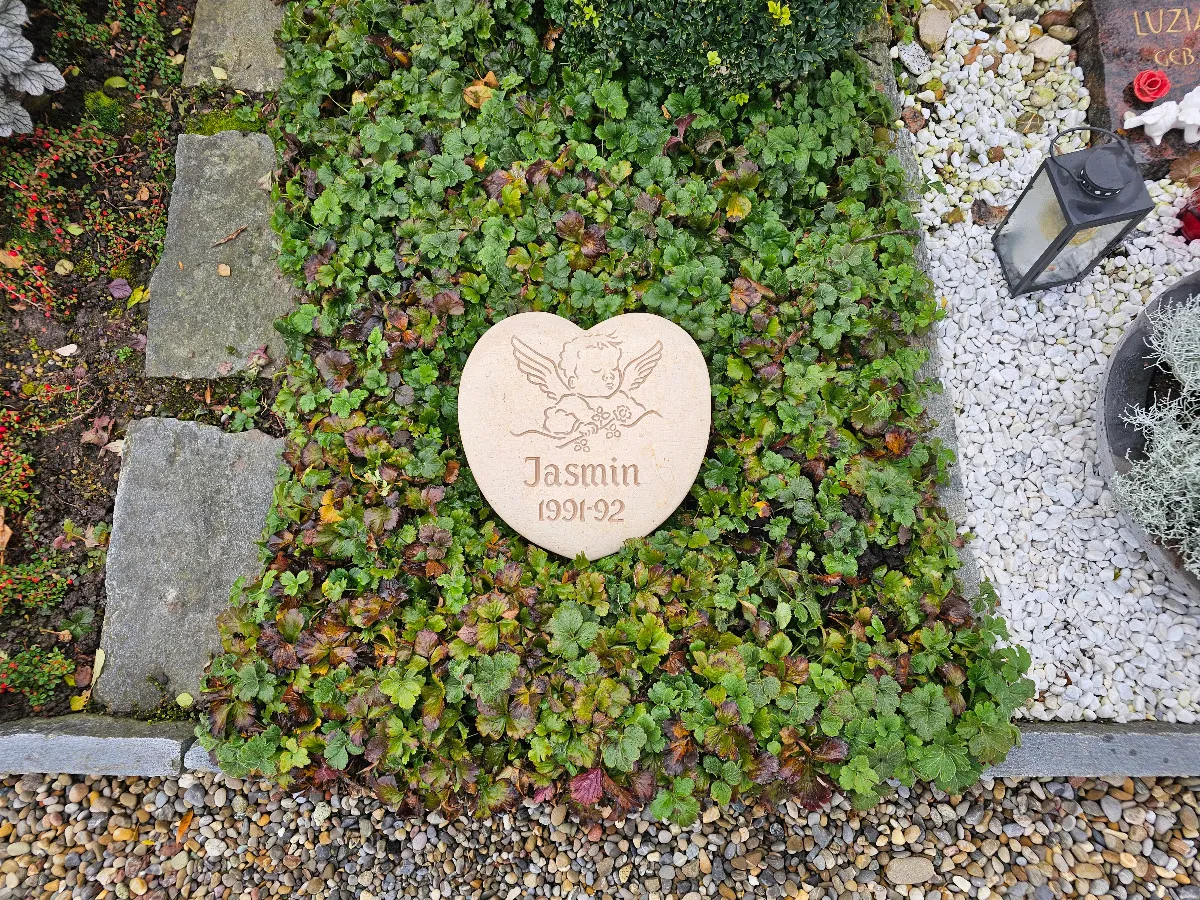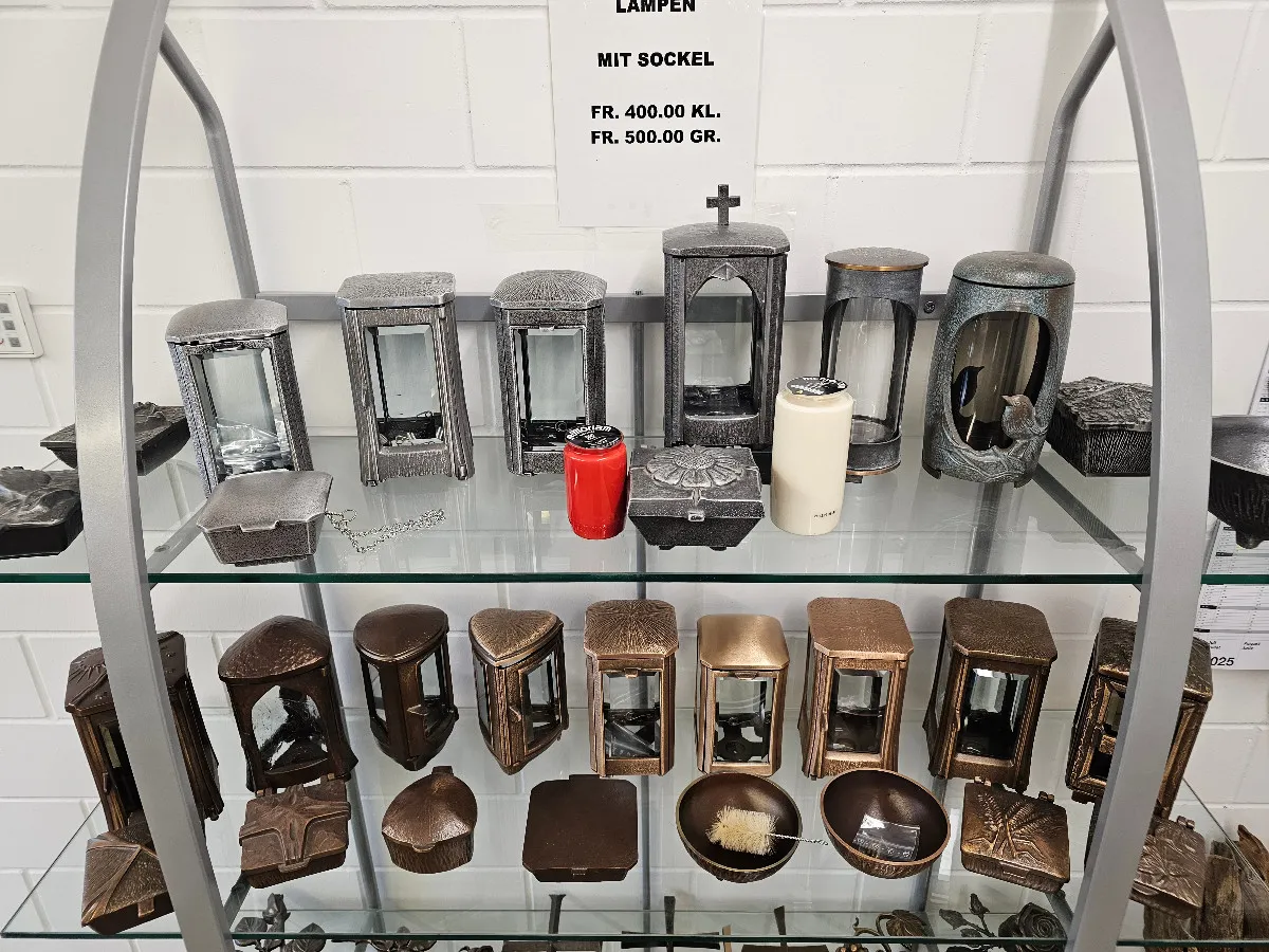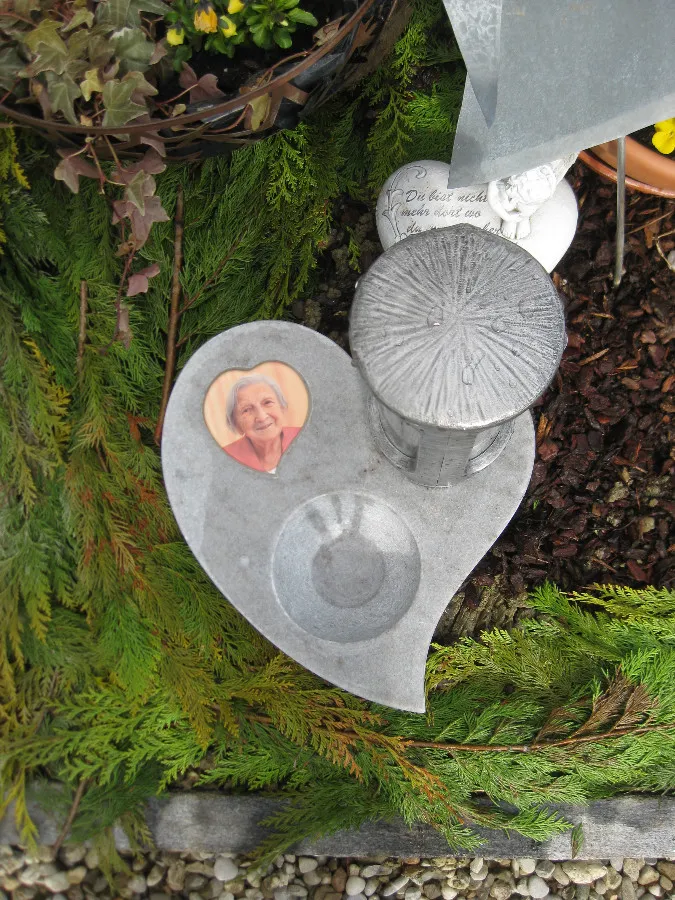 Grablaternen, Weihwassergefässe, Fotosteine, Steinherzen mit Spruch